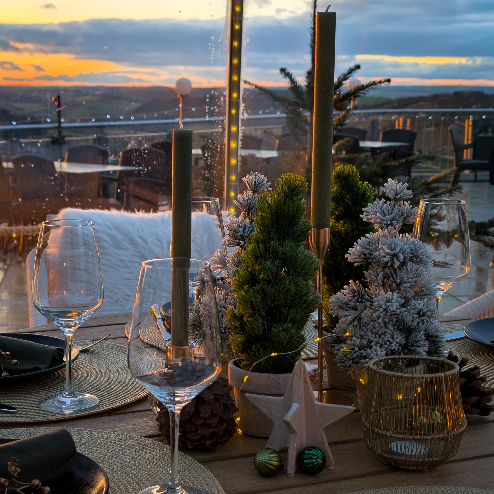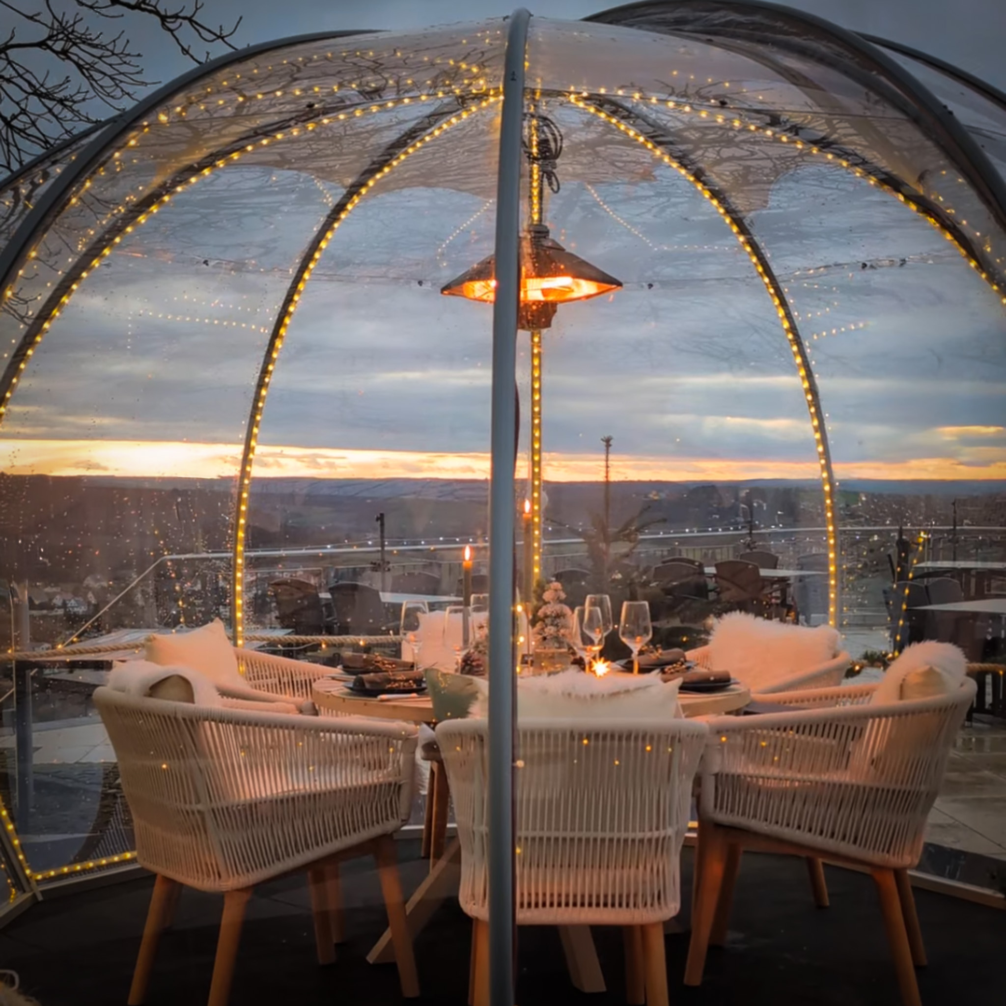 Erleben Sie das Unstruttal von seiner schönsten Seite. In unserer stilvollen, beheizten Kuppel auf der Hotelterrasse erwartet Sie ein atemberaubender Panoramablick über Freyburg, eingerahmt von den malerischen Weinbergen. Ein Platz, an dem die Zeit langsamer vergeht und jeder Moment zum Genuss wird.