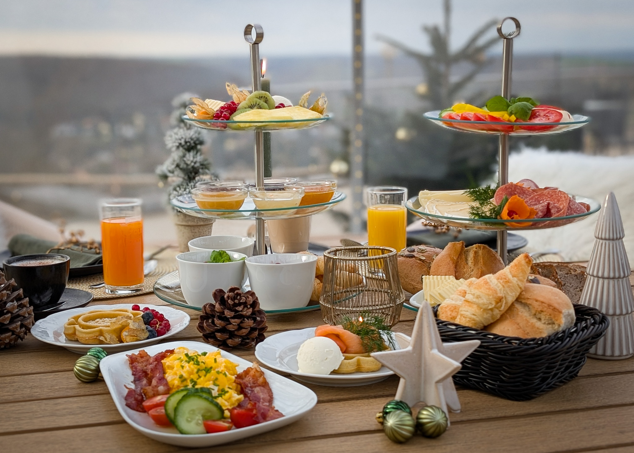 Auch der Morgen wird zum Genussmoment: Starten Sie entspannt in den Tag mit unserem Frühstücksangebot in der Kuppel, während Sie den Ausblick über die Weinberge genießen. Ob mit den besten Freunden oder mit der Familie, es gibt keinen schöneren Ort, um in den Tag zu starten.