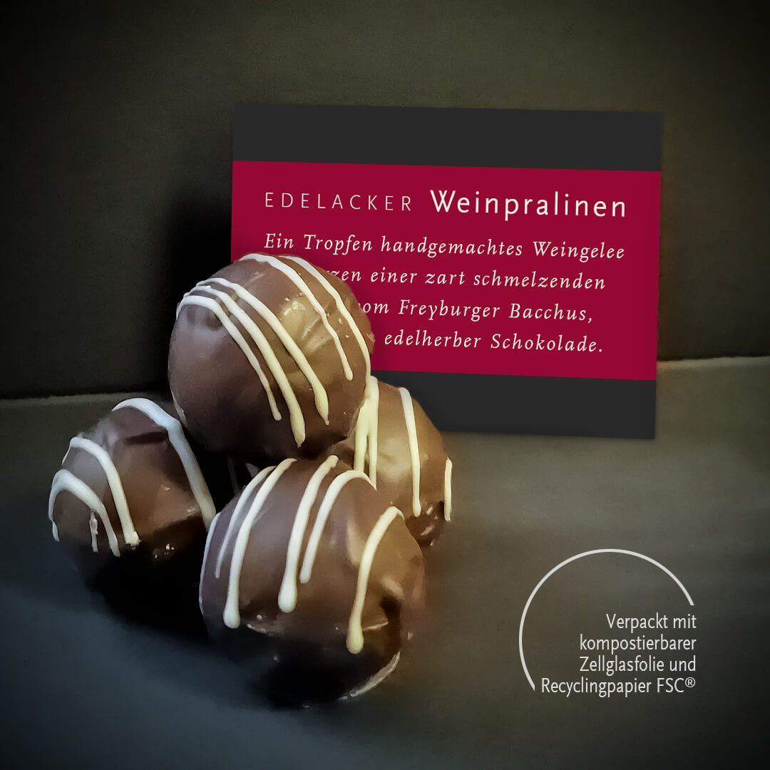 Edelschokolade aus bestem Kakao aus Venezuela, umhüllt eine samtige Ganache aus Freyburger Bacchus der "Edition Edelacker" und einen Tropfen von rotem Weingelee. Das Weingelee aus Dornfelder, verfeinert mit Rosmarin und Tonkabohne, bildet die geschmackliche Spitze dieser Pralinen.