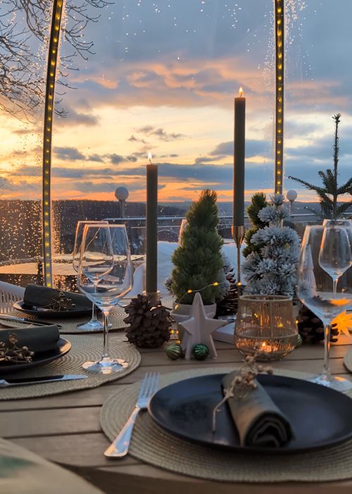 Während draußen die Kälte glitzert, sitzen Sie drinnen wohlig warm, umgeben von stimmungsvoller Beleuchtung und einem Ambiente, das gleichzeitig gemütlich und außergewöhnlich ist. Lehnen Sie sich zurück, blicken Sie in den Sonnenuntergang und lassen Sie sich kulinarisch verwöhnen.